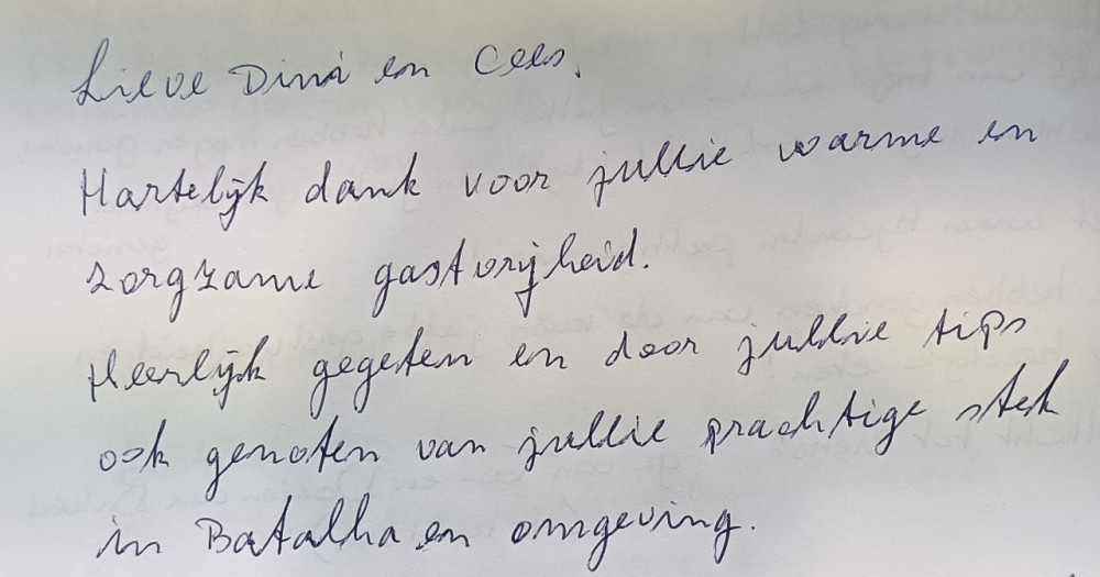 Het ontbijt was iedere ochtend een feestje, het was zoveel dat we de lunch vaak overlieten gaan. Ook de tips die jullie gaven hebben we gewaardeerd. We reizn nu door naar Porto en zeggen geen gedag, maar graag "Tot ziens" .